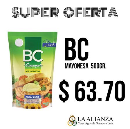 El medio kilo de mayonesa de la marca BC está a 63 pesos con 70 centavos en el salón de calle Irigoyen 229 de la ciudad.