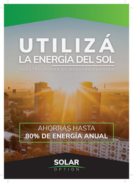 El mensaje expresa 'Utilizá la energía del sol... nuestro hogar es el planeta. Ahorrás hasta un 80 por ciento de energía anual con Solar Option. Termotanques de varias capacidades, con aislación térmica, resistentes al granizo'.