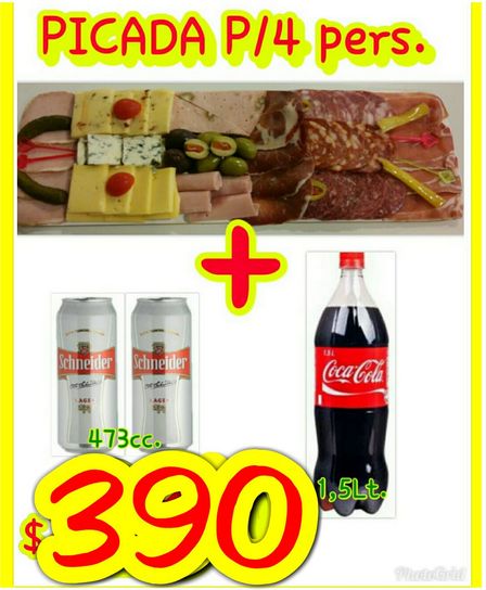 La Tablita tiene dos latas de cerveza Schneider de 390 cc, más una Coca Cola de 1 litro y medio, más una picada para cuatro personas a 390 pesos.