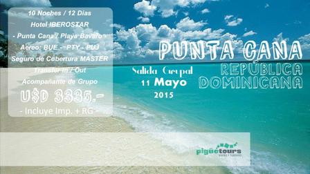 Pigüé Tours Empresa de viajes y turismo se encuentra promocionando un viaje grupal a Punta Cana, en República Dominicana, con 10 noches, 12 días, en el Hotel Iberostar, con seguro, pasajes aéreos, a un valor de 3.335 dólares con impuestos + RG.