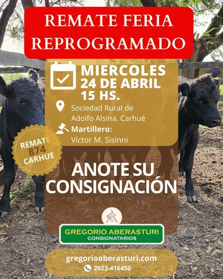 La subasta de vacunos se hará, el miércoles 24 de abril, a partir de las 15.00 horas, presencial, en la Sociedad Rural Adolfo Alsina, en Carhué, con la presentación previa de una charla acerca de 'Biogeneración de suelos, con almuerzo, y luego la subasta a cargo del Martillero Víctor M. Sisinni para la firma Gregorio Aberasturi Consignatarios.
