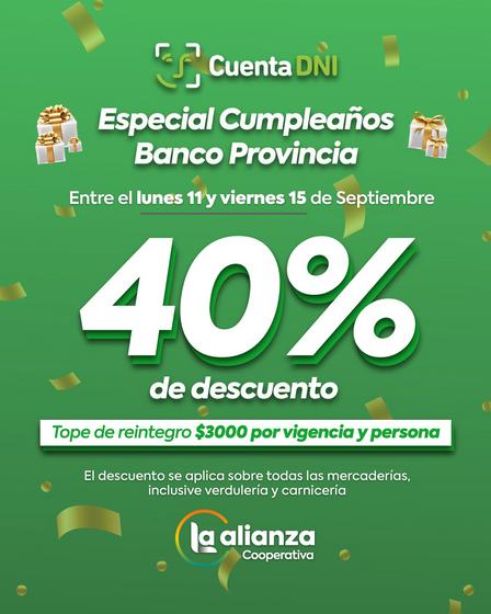 Hay un 40 por ciento de ahorro en todas las mercaderías de autoservicio, inclusive verdulería y carnicería, los días 11, 12, 13, 14 y 15 de septiembre con Cuenta DNI