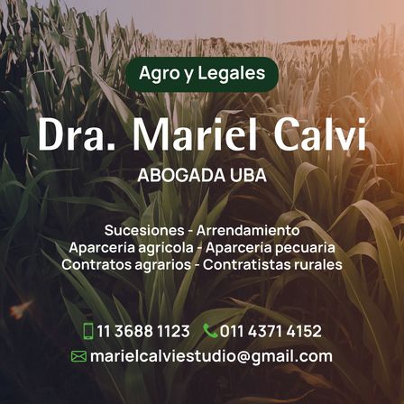 La Dra. Mariel Calvi - Abogada Universidad de Buenos Aires desarrolla labores vinculadas a sucesiones, arrendamiento, aparcería agrícola y pecuaria, contratos agrarios y contratistas rurales.