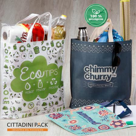 Las bolsas ecológicas pueden ser de un color y las asas de otro con estampas a elección.