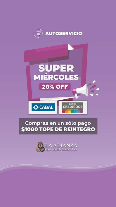 Este miércoles, 11 de enero, en las compras de todos los productos del Autoservicio de Cooperativa La Alianza, los usuarios de la tarjeta Cabal, del Banco Credicoop, tendrán un 20 % de descuento con 1.000 pesos de tope de reintegro.