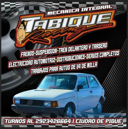 El taller de mecánica integral Tabique Racing, de Franco Tantignoni, trabaja en frenos, suspensión, tren delantero y trasero, electricidad del automotor, distribuciones, servicios completos, y desarrollos en autos de cuarto de milla.