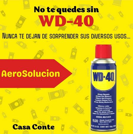 Para eliminar ruidos, aflojar piezas oxidadas, libera mecanismos trabados y desplazar la humedad el WD 40 es destacado desde Casa Conte.