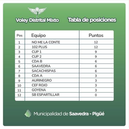 El Torneo de Vóley Mixto Distrital tiene a los equipos de 'No me la conté' y '102 Plus' sumando 12 puntos cada uno para encabezar la tabla de posiciones.