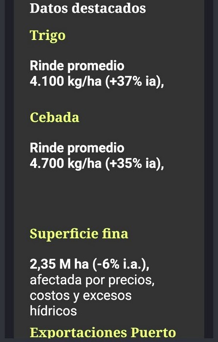 Las heladas intensas de fines de octubre fueron el principal factor adverso, afectando especialmente al trigo en etapas críticas y generando pérdidas de rendimiento de magnitud variable. Pese a ello, el ciclo concluyó bajo condiciones ambientales mayormente favorables, dando lugar a una campaña de muy alto volumen productivo, con fuertes contrastes entre zonas y lotes".