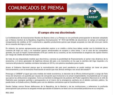 En un comunicado CARBAP se expresa contrario a la determinación de otorgar los créditos al 24 por ciento solo a quienes no tengan acopiada una cantidad máxima de granos de trigo o soja al 5 %.