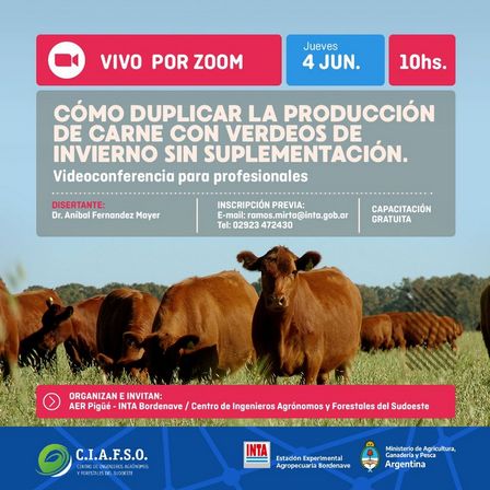 Prevista para el jueves 4 de junio, a las 10.00 horas, se llevará a cabo la videoconferencia para profesionales titulada ‘Como duplicar la producción de Carne con Verdeos de Invierno sin suplementación’.