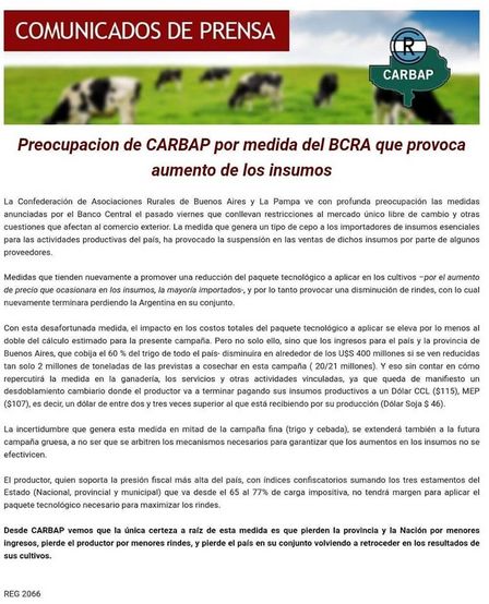 Frente a una nueva resolución del Banco Central de la República Argentina la Confederación de Asociaciones Rurales de Buenos Aires y La Pampa dio a conocer su postura.