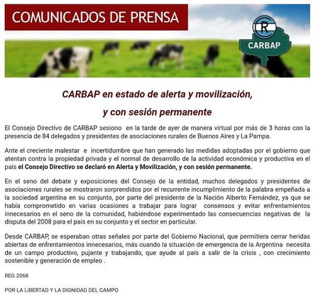 El comunicado de prensa fue presentado declarando a la Confederación de Asociaciones Rurales de Buenos Aires y La Pampa en estado de alerta y movilización, con sesión permanente.