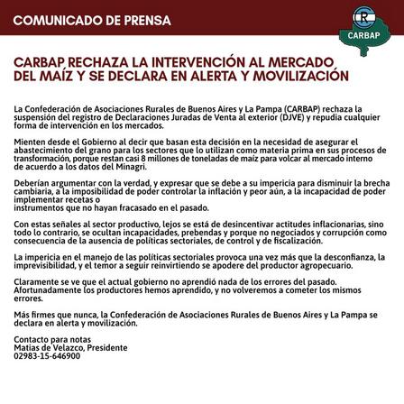 A través de un comunicado la Confederación de Rurales de Buenos Aires y La Pampa expresó su rechazo al anuncio nacional de decretar la intervención del mercado de maíz.