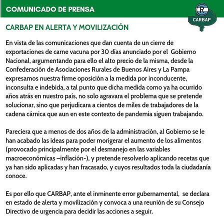 La Confederación de Rurales de Buenos Aires y La Pampa se declaró en estado de movilización y alerta.
