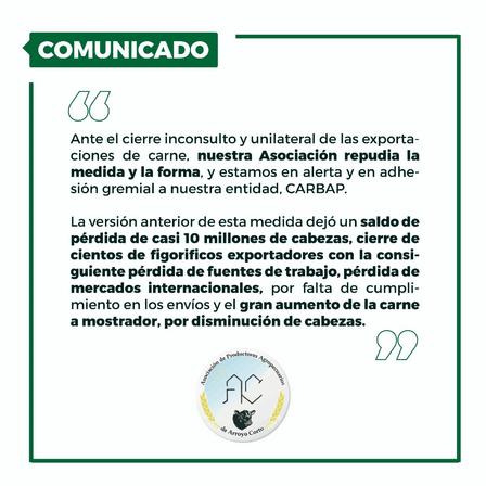 El mensaje dice 'ante el cierre inconsulto y unilateral de las exportaciones de carne, nuestra Asociación repudia la medida y la forma, y estamos en alerta y en adhesión gremial a nuestra entidad CARBAP.