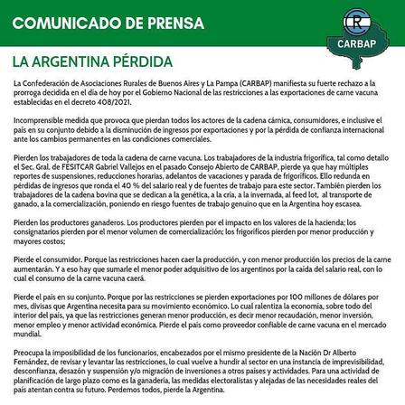 En su parte de prensa CARBAP sostiene que “con el cierre de las Exportaciones de Carne perdemos todos. Pierde Argentina”.