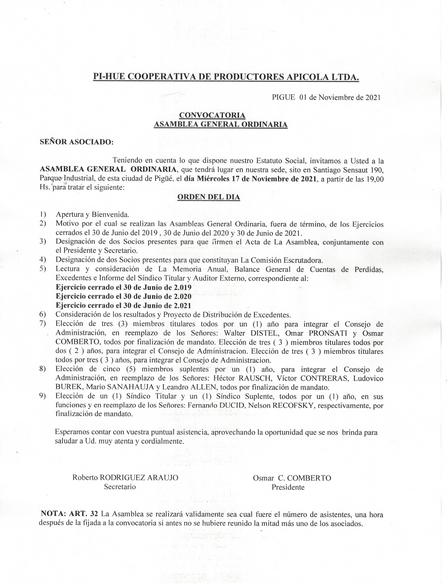 A las 19.00 horas, el día 17 de noviembre, en Santiago Sensaut 190 del Parque Industrial, se llevará a cabo la Asamblea General Ordinaria de la entidad pigüense.