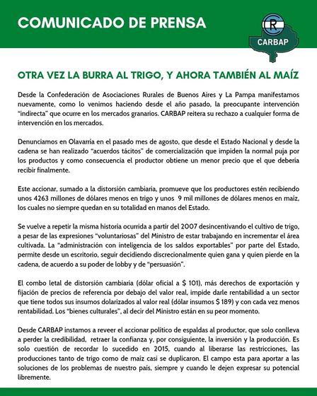 Entre sus líneas CARPBAP expresa que “El Campo está para aportar soluciones a los problemas de nuestro país, siempre y cuando nos dejen expresar su potencial libremente”.