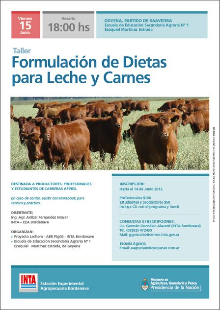 Este viernes, a partir de las 18.00 horas, en la Escuela Agropecuaria de Goyena, tendrá lugar un Taller de Formulación de Dietas para Leche y Carnes organizado por el INTA.