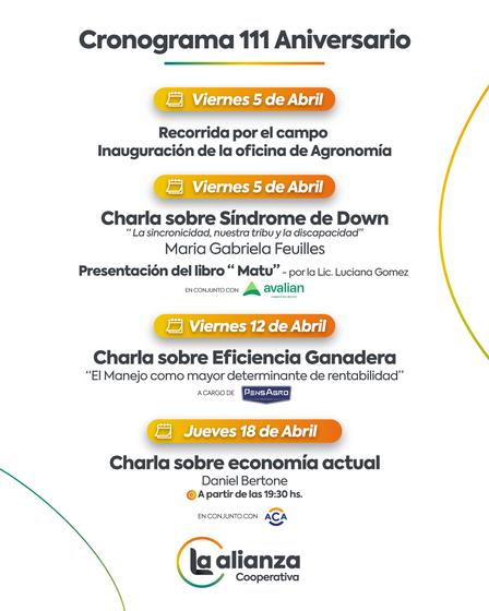 El viernes 12 de abril desarrollarán una charla sobre eficiencia ganadera a cargo de PensAgro, y el jueves 18 de abril habrá una charla sobre Economía Actual, con Daniel Bertone, en conjunto con ACA, desde las 19.30 horas.