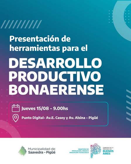 El Ministerio de Producción, Ciencia e Innovación Tecnológica y el Municipio de Saavedra-Pigüé invitan a emprendedores, PYMEs, industrias y comercios a la presentación de Herramientas para el Desarrollo Productivo Bonaerense.