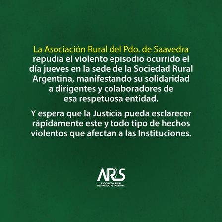 El comunicado considera que "la Asociación Rural del Partido de Saavedra repudia el violento episodio ocurrido el día jueves en la sede de la Sociedad Rural Argentina manifestando su solidaridad a dirigentes y colaboradores de esa respetuosa entidad.