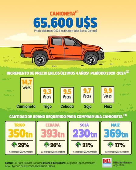 En sus redes sociales el ente estatal expresa que “el informe presenta el costo de adquirir un vehículo para un establecimiento agropecuario expresado en dólares, toneladas de grano y cantidad de hectáreas de cultivo.