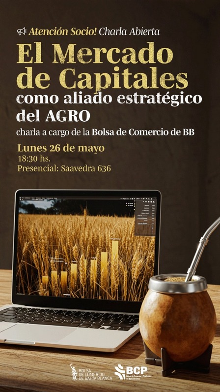 Bajo el título 'El Mercado de Capitales como aliado estratégico del Agro' este encuentro tendrá lugar el día lunes 26 de mayo, a las 18:30 horas, en el Auditorio de la Bolsa de Cereales y Productos de Bahía Blanca, ubicado en calle Saavedra 636.