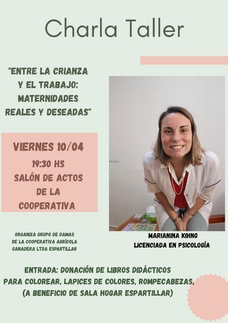 Este encuentro se hará el viernes, 10 de abril de 2026, a las 19.30 horas, en el Salón de Actos de la Cooperativa Agrícola Ganadera de Espartillar, contando con la disertación de la Lic. Marianina Kihn, y la organización del Grupo de Damas de la Cooperativa Agrícola Ganadera de Espartillar