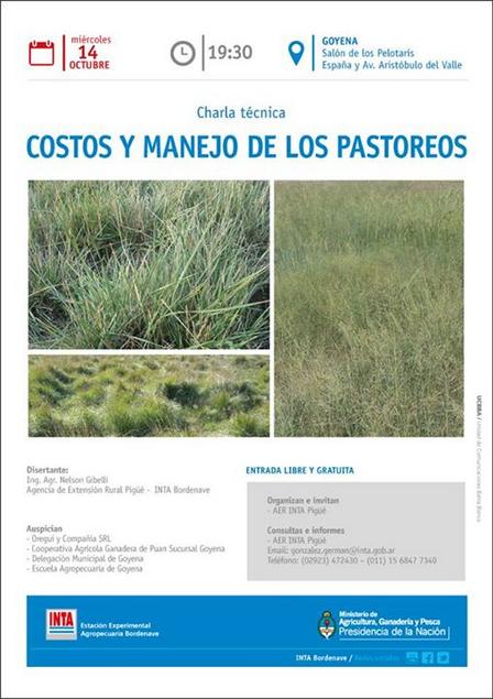 Se hará en Goyena la charla técnica 'Costos y manejo de los pastoreos' el día miércoles 14 de octubre, desde las 19.30 horas. .