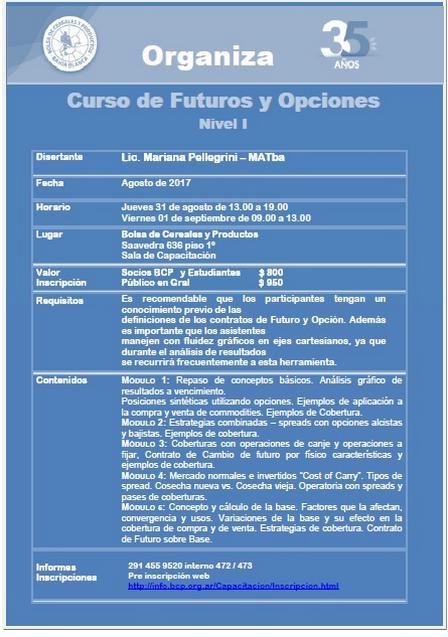 El Curso de Futuros y Opciones tendrá lugar en el transcurso de las próximas semanas, el jueves 31 de agosto y el viernes 1 de septiembre.