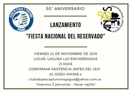 El viernes 23 de noviembre, por la noche, en el predio del Club de Pesca y Turismo de Pigüé se llevará a cabo el lanzamiento de la Fiesta Nacional del Reservado.