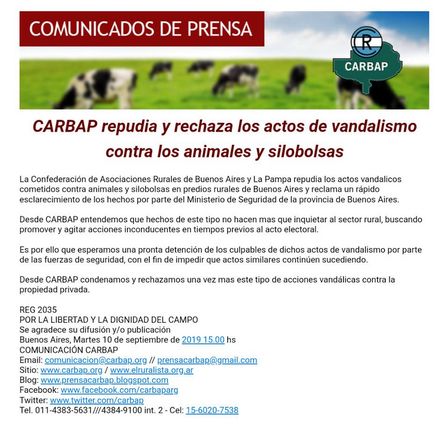 CARBAP, en un parte de prensa, consideró “repudiamos y Rechazamos los actos de vandalismo contra animales y silobolsas”.