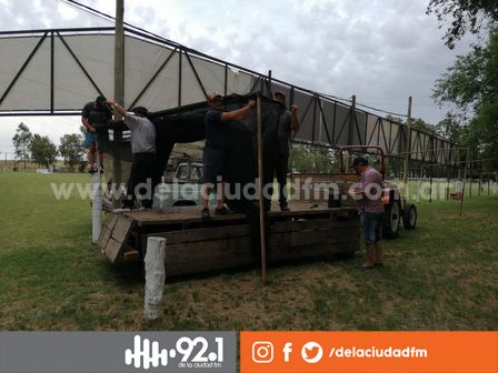 Desde temprano integrantes de comisión y colaboradores trabajan en la colocación de la media sombra que rodea el campo de jineteada.
