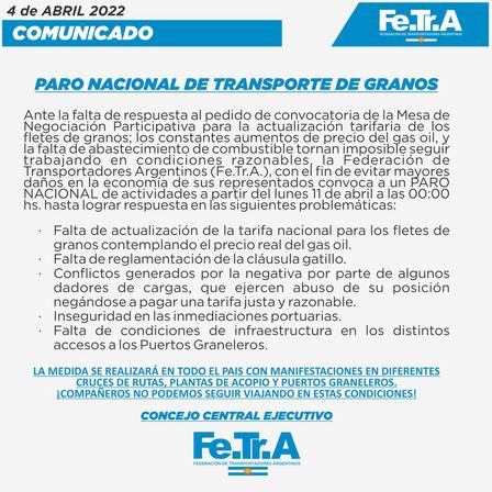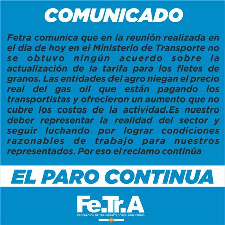 En un parte de prensa expresó "en la reunión realizada en el día de hoy en el Ministerio de Transporte no se obtuvo ningún acuerdo sobre la actualización de la tarifa para los fletes de granos".