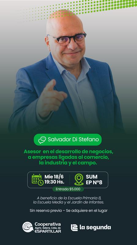Salvador Di Stéfano llegará a Espartillar para brindar una charla sobre las empresas ligadas al comercio, la industria y el campo, el valor de la entrada será de 5.000 pesos, y lo recaudado estará siendo destinado a la Escuela Primaria, la Escuela Media y el Jardín de Infantes de Espartillar.