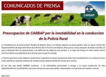 El parte de prensa de la Confederación de Asociaciones Rurales de Buenos Aires y La Pampa es para expresar la ‘preocupación por la inestabilidad en la conducción de la Policía Rural’.