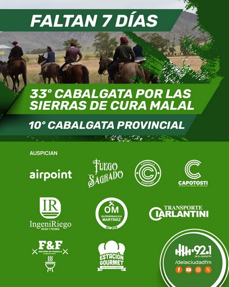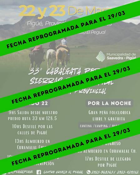 El Centro Criollo El Pegual confirmó que, por los pronósticos de precipitaciones, pospone una semana la Cabalgata por las Sierras de Cura Malal.
