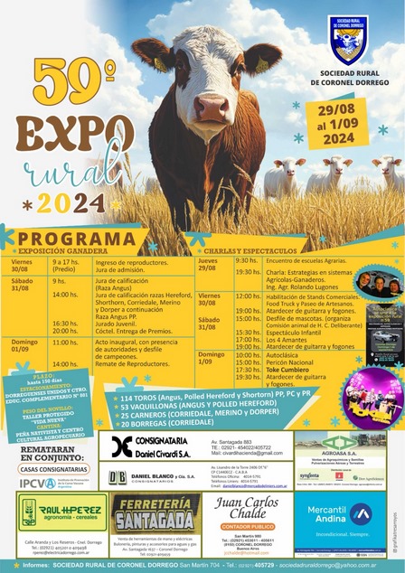 En la muestra agropecuaria del distrito se harán presentes El Medanito de Casimiro Vicente, de Felipe Sola, El Fortín de Productores Agrícolas S.A., de Dufaur, Don Nazareno de Agrohaciendas Nazareno SRL, de Bahía Blanca, La Chingola de Juan Manuel Álvarez, de Coronel Dorrego, La Tigra de Estancias y Cabaña La Centella S.A., de Tornquist, y Las Sierras de Carlos y Marcelo Favre, de Pigüé.