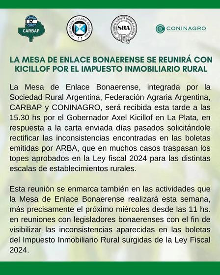 La Mesa de Enlace Bonaerense se reunirá con Axel Kicillof por el Impuesto Inmobiliario Rural.
