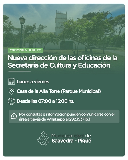 De lunes a viernes, de 7.00 a 13.00 horas, la Secretaría Cultura y Educación Municipal atenderá al público en su nueva dirección.