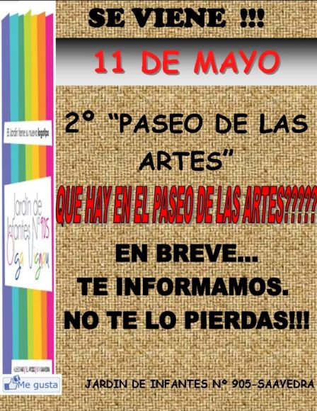 El Jardín de Infantes Nº 905 de Saavedra estará realizando, el 11 de mayo, el 2º Paseo de las Artes en la localidad.