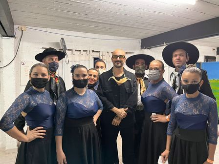 Los integrantes de la Compañía de Danzas de Pigüé compartieron unos instantes con el destacado músico en la Fiesta Nacional de la Cebada Cervecera.