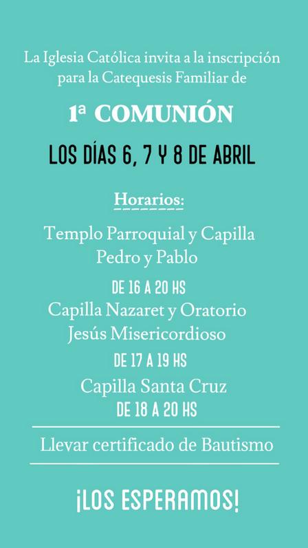 Inscribirán para la Catequesis Familiar de la Primera Comunión en Pigüé