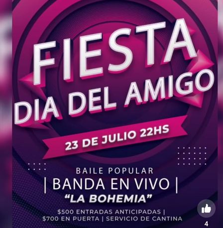 Para celebrar el día del amigo, con servicio de cantina, las anticipadas salen 500 pesos, mientras que, en puerta las entradas costarán 700 pesos.