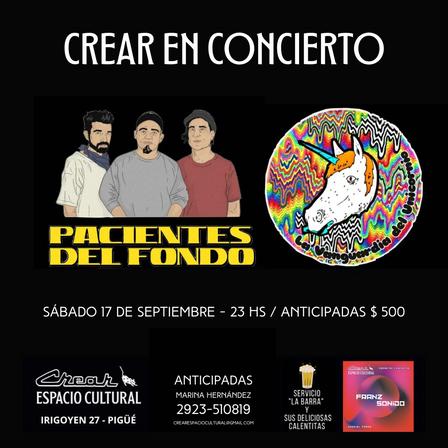 El sábado 17 de septiembre, a las 23.00 horas, estará presentándose Pacientes del fondo con su nuevo álbum llamado ‘La copa real’ y, a su vez, saldrá a escena la banda de rock local La vanguardia del unicornio.