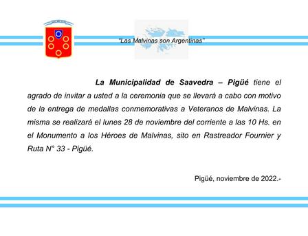 El Municipio de Saavedra – Pigüé confirmó que se hará entrega de medallas a Veteranos de la Guerra de Malvinas.