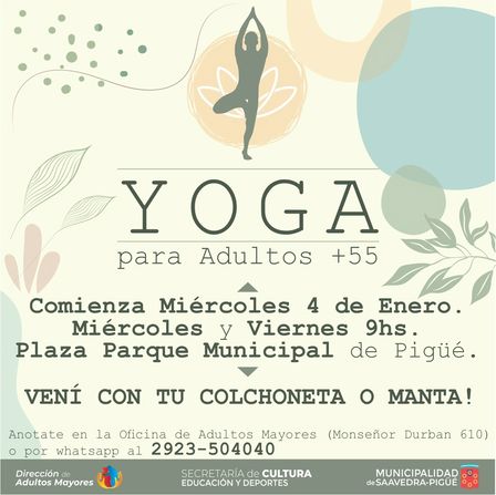 Para estas propuestas de la Dirección de Adultos Mayores, a dictarse los días miércoles y viernes, en la Plaza del Parque Municipal, es posible anotarse previamente en Monseñor Durban 610 de Pigüé o bien al 2923 50 40 40.