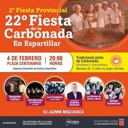 La Fiesta de la Carbonada, a llevarse a cabo en Espartillar, tendrá artesanos, manualistas, el tradicional menú elaborado por Las Carboneras, y habrá de contar con los shows de Desiguales Folclore, la Peña Municipal La Fortinera de Carhué, Los Creadores de 30 de Agosto, el humor de Alejandro Gardinetti, Los Minions de Jamón y Queso, Daiana Colamarino, y la DJ Jazmín Migliavaca.
